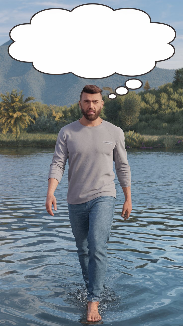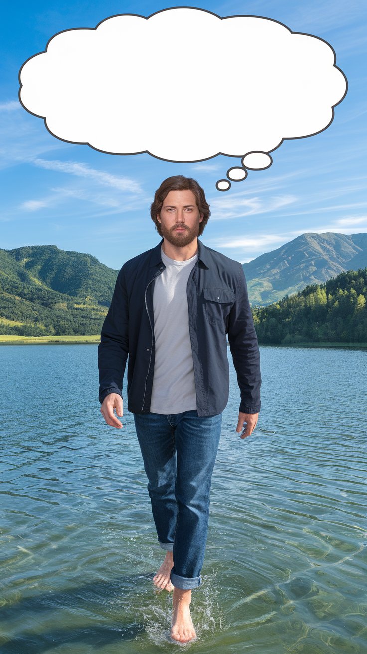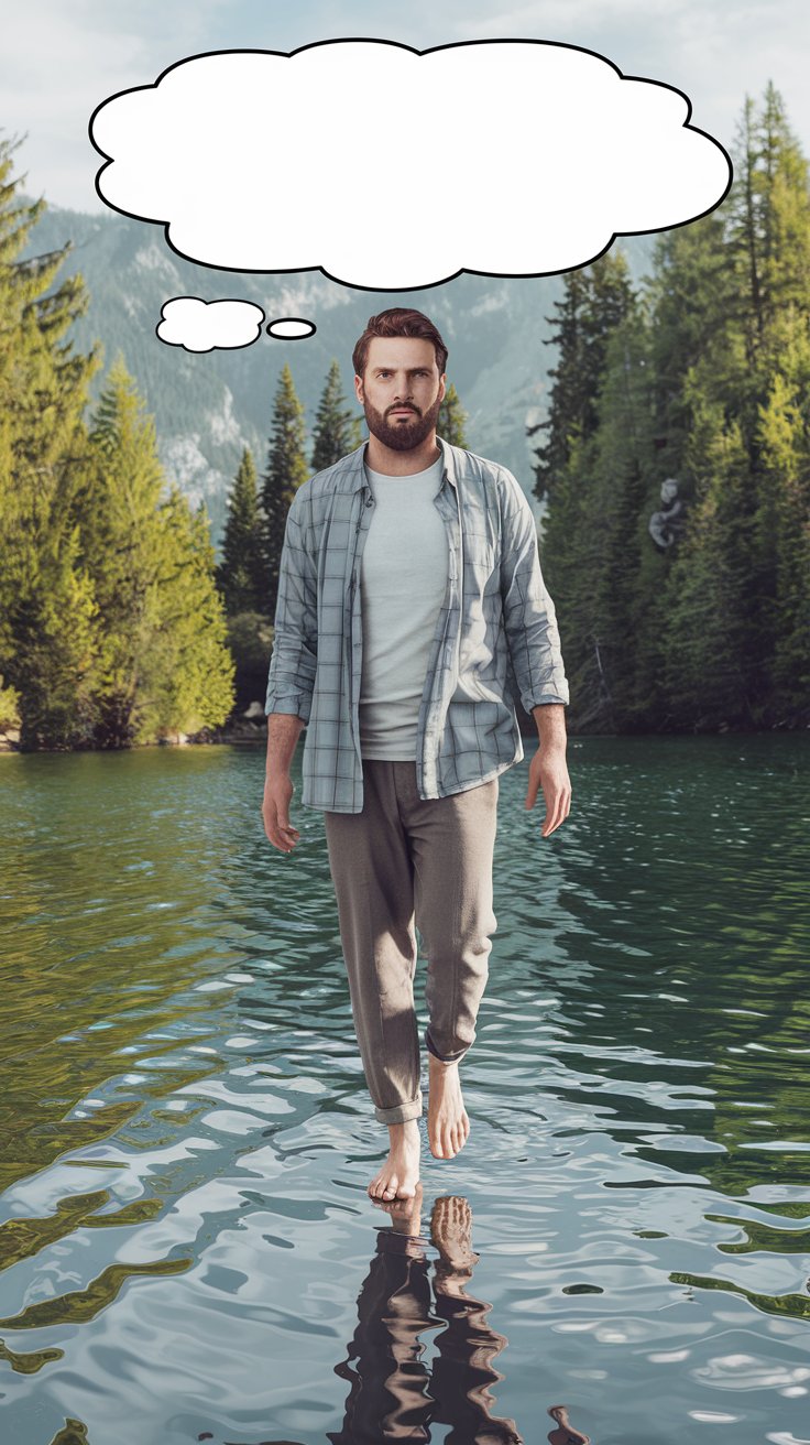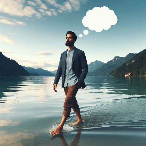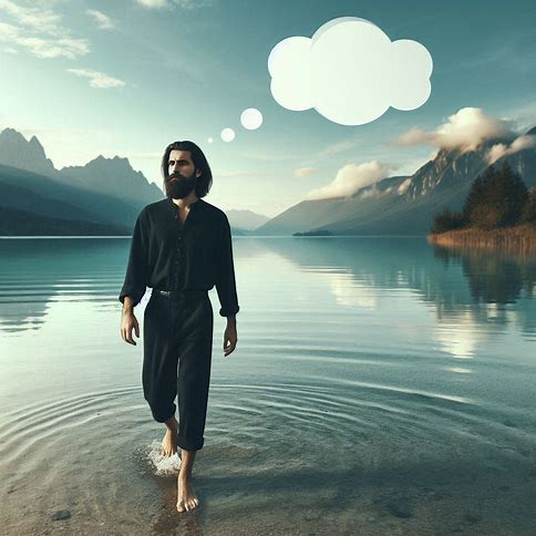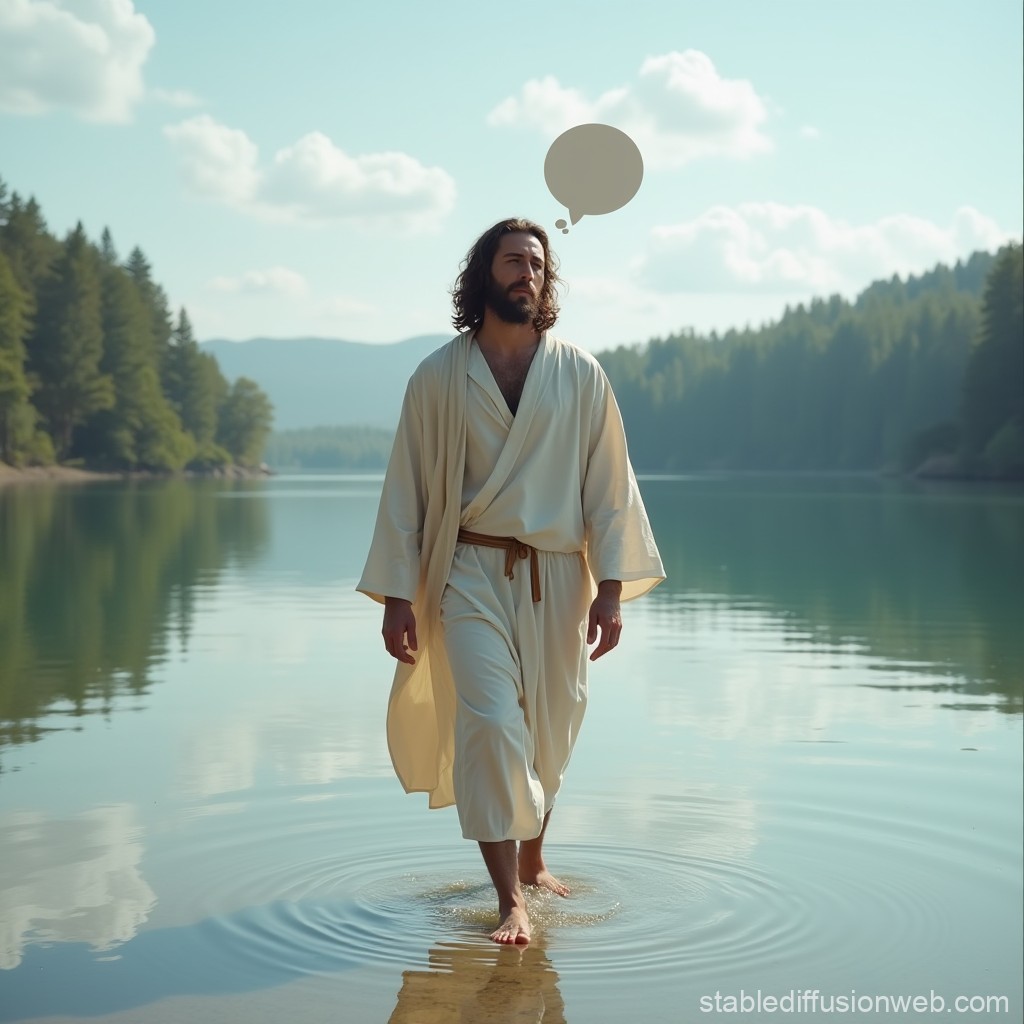 Erstelle ein fotorealistisches Bild, auf dem eines Mannes in einem modernen Casualoutfit, dessen Gesicht, Bart und Frisur bewusst an Jesus erinnern soll, und der barfuß auf dem Wasser eines schönen Sees spazieren geht (wie Jesus). Über seinem Kopf ist eine leere Gedankenblase.