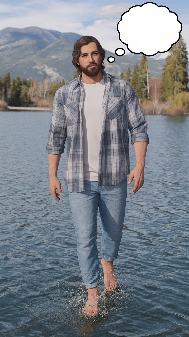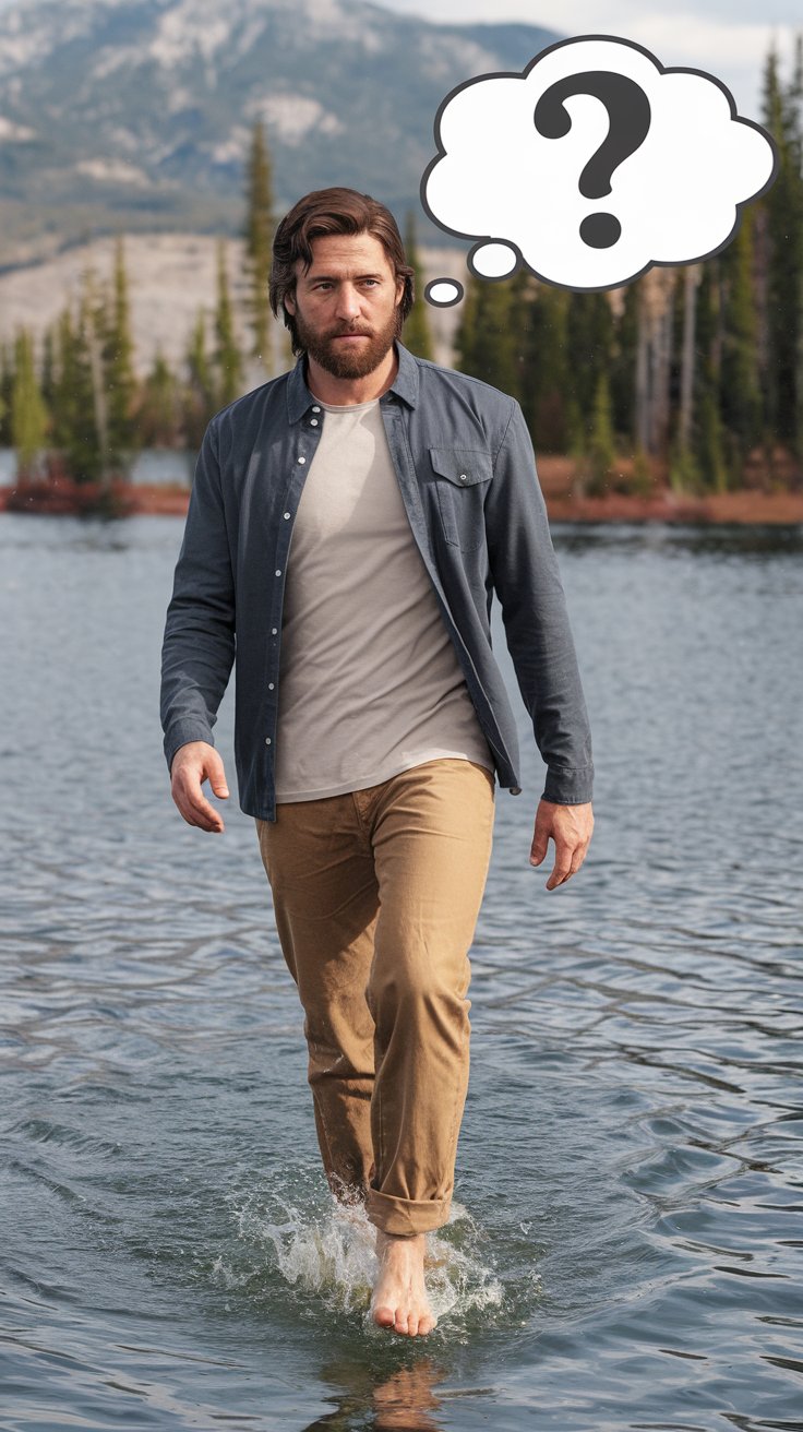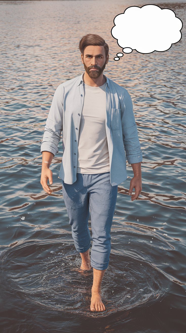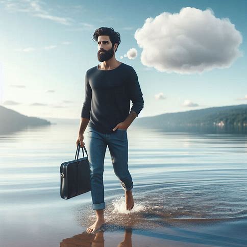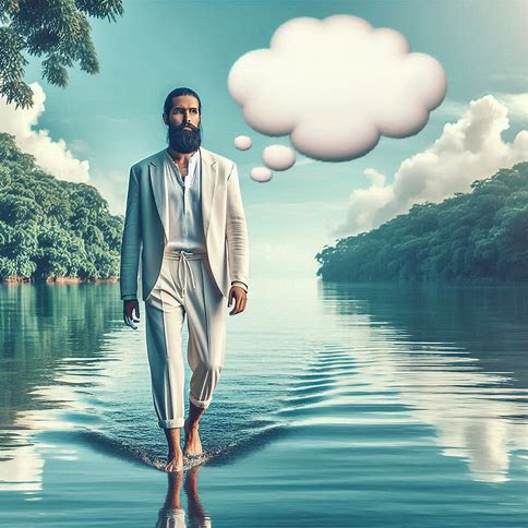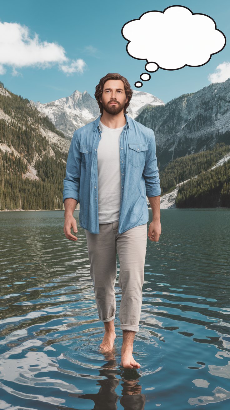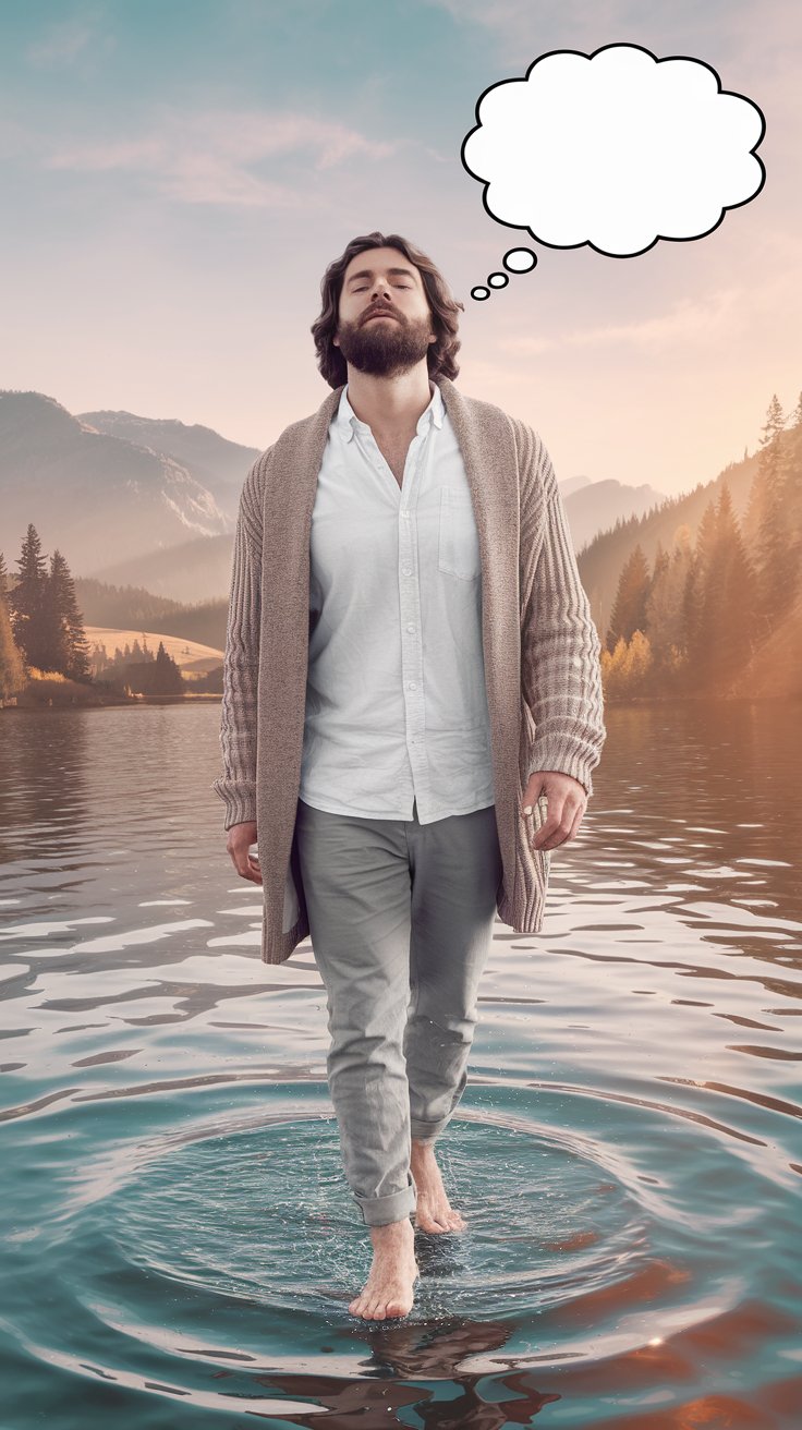 Erstelle ein fotorealistisches Bild, auf dem eines Mannes in einem modernen Casualoutfit, dessen Gesicht, Bart und Frisur bewusst an Jesus erinnern soll, und der barfuß auf dem Wasser eines schönen Sees spazieren geht (wie Jesus). Über seinem Kopf ist eine leere Gedankenblase.